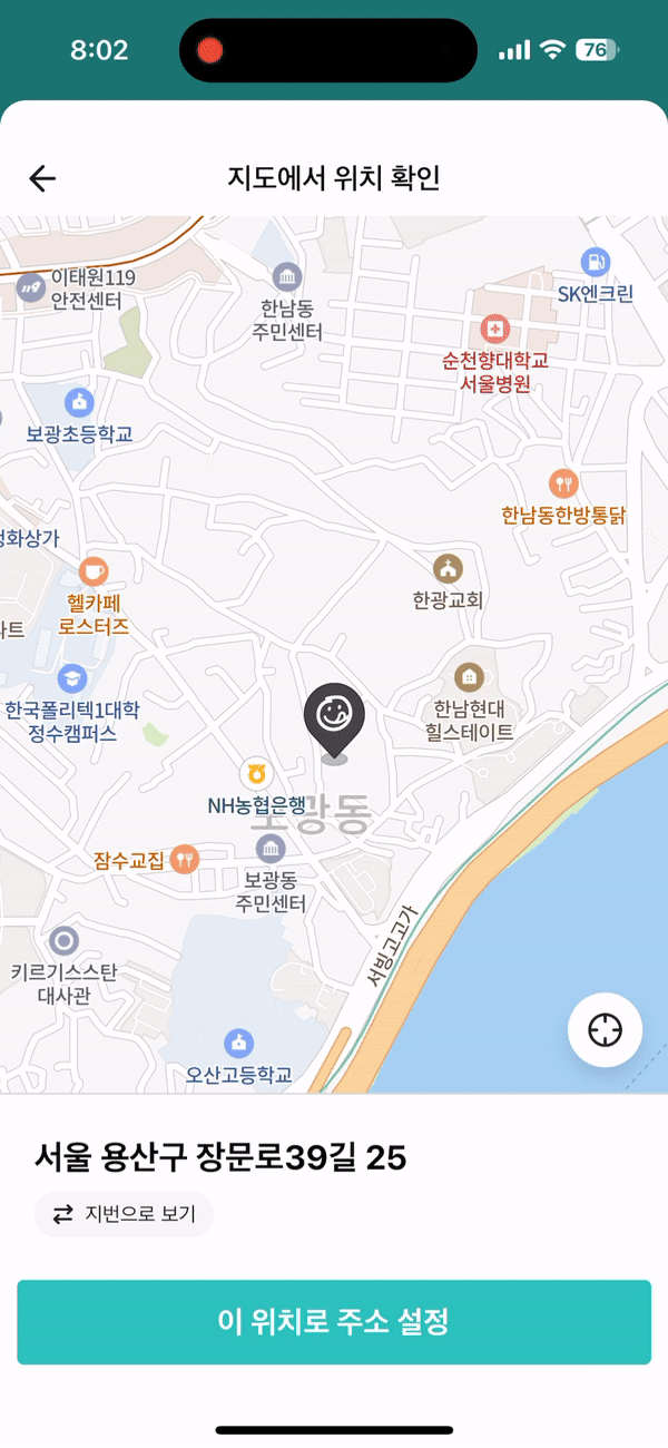 ๋ง์ง๋ง ์ธ ๋ฒ์งธ๋ ์ฌ์ฉ์์ ํ์ฌ ์์น๋ฅผ ๊ฐ์ ธ์ค๊ณ , ๋ฒํผ์ ํด๋ฆญํ๋ฉด ์ฌ์ฉ์์ ํ์ฌ ์์น๋ก ์ด๋ํ๋ ๊ธฐ๋ฅ์ด๋ค.