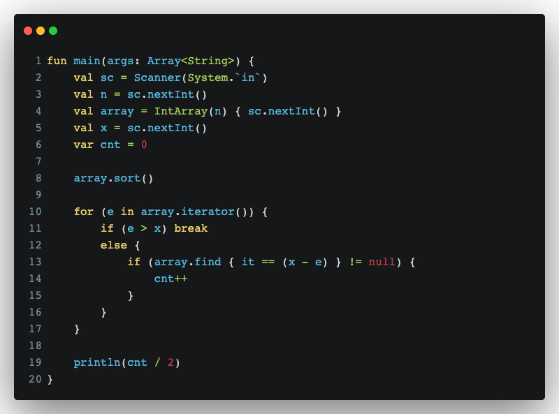 n๊ฐ์ ์๋ก ๋ค๋ฅธ ์์ ์ ์ a1, a2, ..., an์ผ๋ก ์ด๋ฃจ์ด์ง ์์ด์ด ์๋ค. ai์ ๊ฐ์ 1๋ณด๋ค ํฌ๊ฑฐ๋ ๊ฐ๊ณ , 1000000๋ณด๋ค ์๊ฑฐ๋ ๊ฐ์ ์์ฐ์์ด๋ค. ์์ฐ์ x๊ฐ ์ฃผ์ด์ก์ ๋, ai + aj = x (1 ≤ i < j ≤ n)์ ๋ง์กฑํ๋ (ai, aj)์์ ์๋ฅผ ๊ตฌํ๋ ํ๋ก๊ทธ๋จ์ ์์ฑํ์์ค.