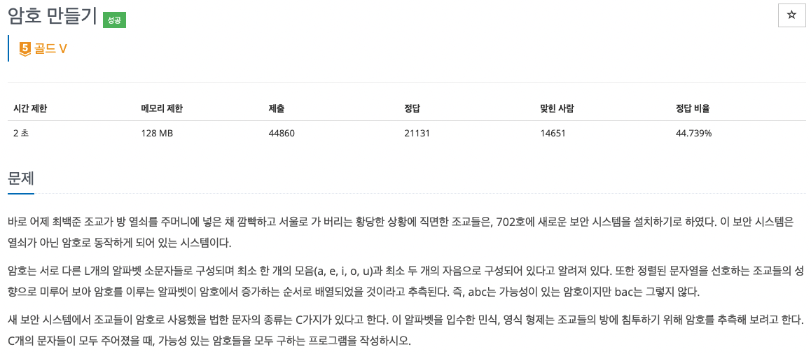 ์ค๋ฆ์ฐจ์ ์ผ๋ก ์ ๋ ฌ๋ ๋ฌธ์์ด์์ ์์, ๋ชจ์์ ๊ฐ์๋ฅผ ํ์ธํ์ฌ ์ถ๋ ฅํ๋ ๋ฐฑํธ๋ํน ๋ฌธ์ ์ด๋ค.