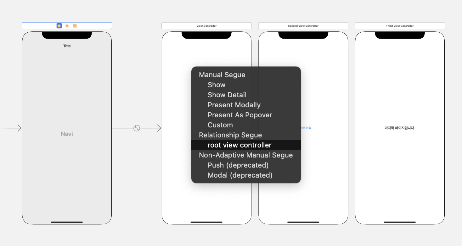 Navigation Controllerλ₯Ό μΆκ°νλ©΄ 2κ°μ View κ° μΆκ°λλλ° Root View λ₯Ό μ κ±°νκ³ Navigation Controller μμ Ctrl + λλκ·Έ λ₯Ό ν΅ν΄ μ²μμ 보μ¬μ§ View μ μ°κ²°νλ€. μ¦, κΈ°λ³Έμ μΌλ‘ μμ±λ Root View λ₯Ό μ κ±°νκ³ μλ‘κ² Root View λ₯Ό μ€μ νλ κ²μ΄λ€.
