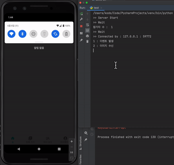 μ¬μ©μμκ² λ°±κ·ΈλΌμ΄λ μλΉμ€κ° μ€νλκ³ μλ κ²μ μλ ΈμΌλ μ΄μ λ°±κ·ΈλΌμ΄λμμ μμΌ ν΅μ μ μ§ννλ©΄ λλ€. μμ λ§ν κ²μ²λΌ μμΌ ν΅μ μ ν΅ν΄ μλ²λ‘λΆν° μ΄λ²€νΈλ₯Ό μμ νκ³ μ΄λ²€νΈμ μ’ λ₯μ λ°λΌ κ°κΈ° λ€λ₯Έ μλ¦Όμ λμμΌνλ€. μ°μ κ°λ¨νκ² μλ²μμ 1μ μ μ‘νλ©΄ μ΄λ²€νΈ λ°μ μλ¦Ό, 2λ₯Ό μ μ‘νλ©΄ μ΄λ―Έμ§ μ νμ΄λΌλ μλ¦Όμ λμμ£Όλλ‘ κ΅¬ννλ€.