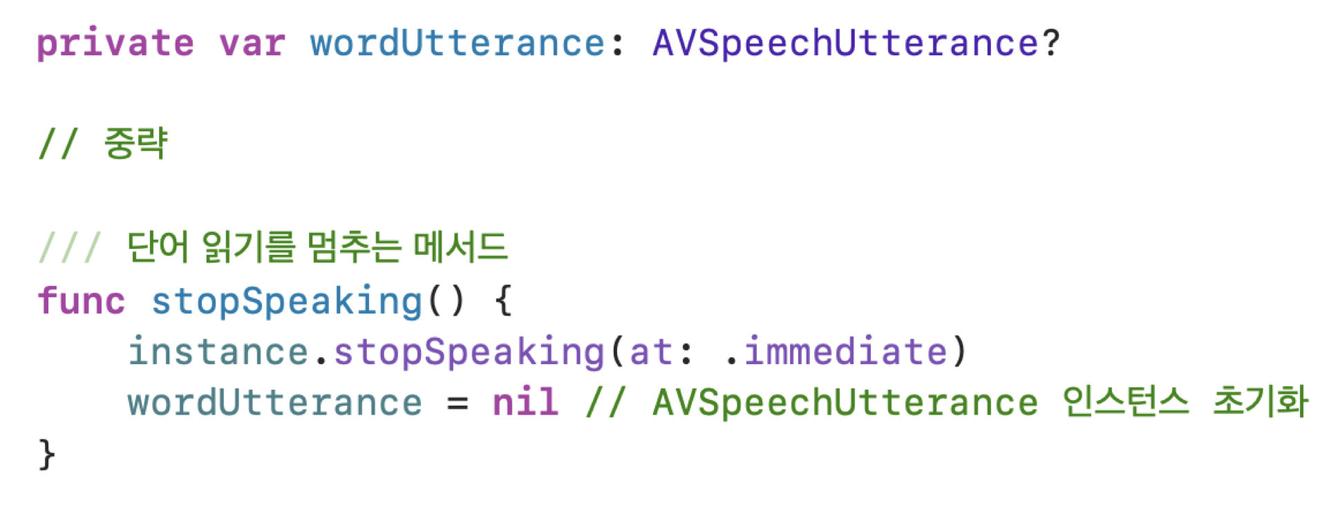 wordUtterance๋ฅผ ์ ๊ฑฐํ๋ ๊ฒ์ด ์๋๋ผ ์ด๋ฅผ ๋ด๊ณ ์๋ AVSpeechSynthesizer ์์ฒด๋ฅผ ์ ๊ฑฐํ๋ ๋ฐฉํฅ์ผ๋ก ๋ง์ด๋ค.