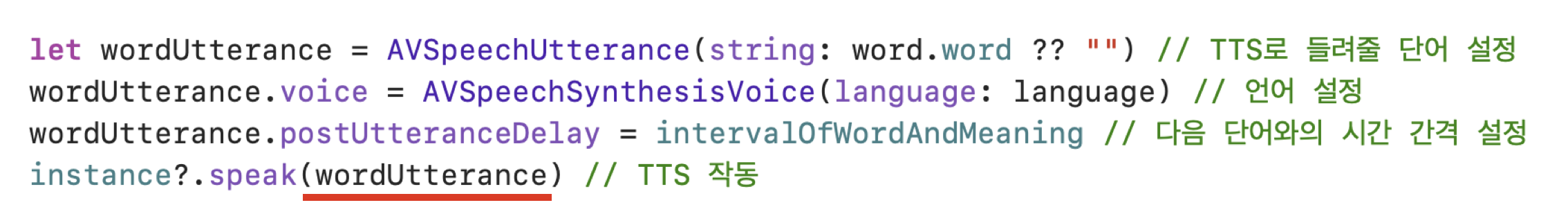 let wordUtterance = AVSpeechUtterance(string: word.word ?? "") // TTS๋ก ๋ค๋ ค์ค ๋จ์ด ์ค์