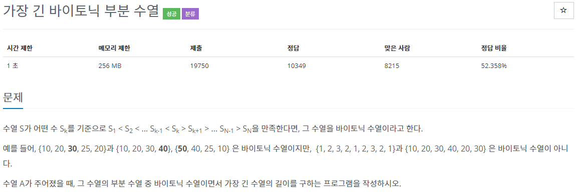 ๋ฌธ์ ๋ฅผ ๋ณด๋ฉด 1 < S2 < ... Sk-1 < Sk > Sk+1 > ... SN-1 > SN ์ด๋ฌํ ๊ผด์ ๋ง์กฑํ๋ ์์ด์ด ๋ฐ์ดํ ๋ ์์ด์ด๋ผ๊ณ ๋์์๋ค.