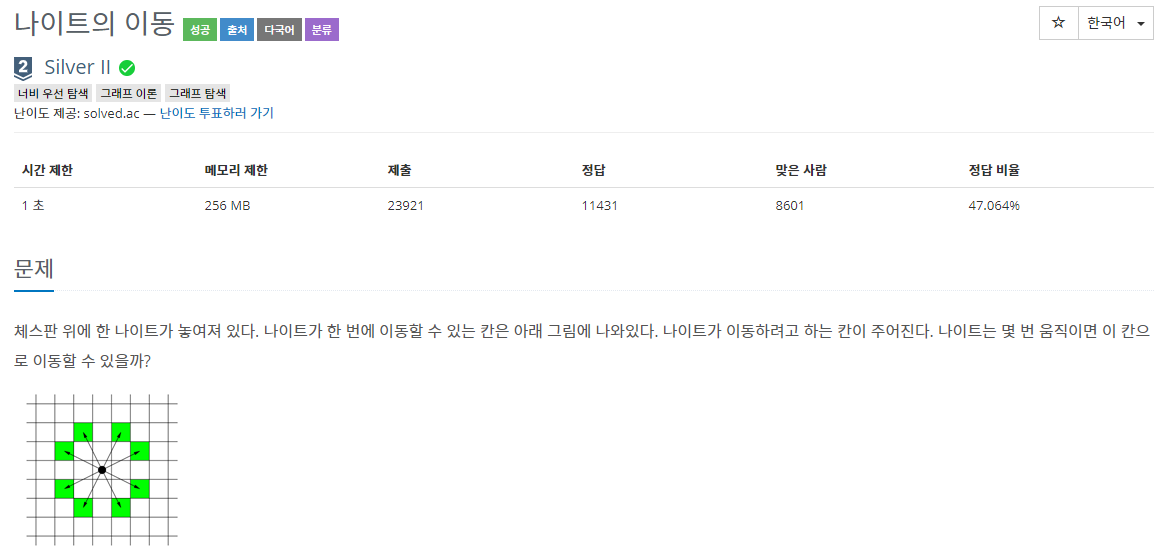 BFS ํ์ฉ ๋ฌธ์ ์ด๋ค. ๋์ดํธ๊ฐ ์ด๋ํ ์ ์๋ ๋ฒ์๋ ์ด 8๊ฐ๋ก ์๋์ ๊ฐ๋ค.