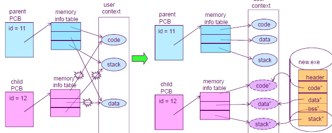 fork()๋ฅผ ํด์ ์์ ํ๋ก์ธ์ค๋ฅผ ๋ง๋ค๊ณ exec()๊ฐ ์คํ๋๋ฉด user context์ ์ฐ๊ฒฐ๋ ๋ชจ๋ ๊ณ ๋ฆฌ๋ฅผ ๋๊ณ ์๋ก์ด user context์ ์ฐ๊ฒฐ