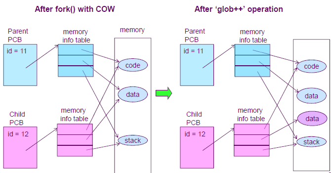fork๋ฅผ ํ์ ๋ code, data, stack ๋ถ๋ชจ์ ๊ฐ์ ์์ญ์ ๊ฐ๋ฅดํค๊ฒ ํ๊ณ , ๊ฐ์ ๋ณ๊ฒฝ์ด ์๋ ๊ฒฝ์ฐ ํด๋น ์์ญ์ ๋ณต์ฌํ๋ ๋ฐฉ์.