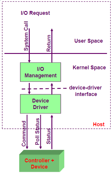 -> ์ฅ์น ๋๋ผ์ด๋ฒ๊ฐ ์ฅ์น๋ฅผ ์ง์ ๊ด๋ฆฌ -> ์์ ์ด ๋๋ ๋๊น์ง Status๋ฅผ ๊ณ์ ๊ฒ์ฌํ๋ฉฐ Busy Waiting ์ํ๋ก ์กด์ฌ