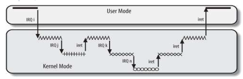 Interrupt ๋์ค์ ์๋ก์ด Interrupt๊ฐ ๋ฐ์ํ๋ฉด ์ด๋ฏธ ์ปค๋ ๋ด๋ถ์ด๋ฏ๋ก Mode Change๋ ํ์์๋ค.