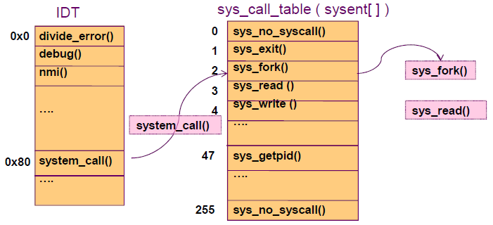 -> Interrupt Handler -> IDT -> ISR -> SCT(System Call Table)