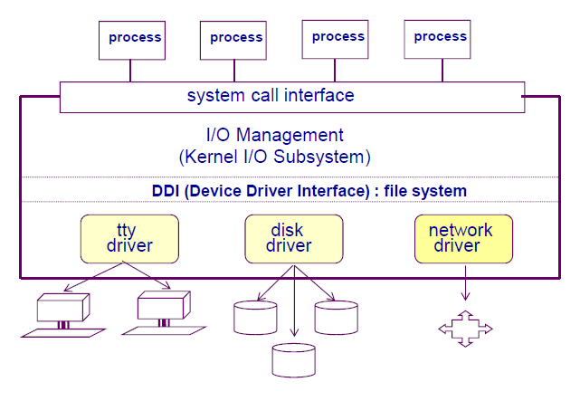 ํ๋ก์ธ์ค๊ฐ I/O๋ฅผ ์์ฒญํ๋ฉด ์์คํ ์ฝ์ ์ํด ์ปค๋ ๋ชจ๋๋ก ์ ํ์ด ๋๊ณ I/O Management์๊ฒ ๋ช ๋ น์ ์ ๋ฌํ๋ค.