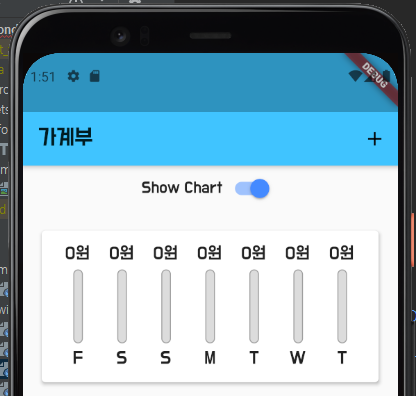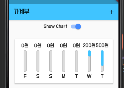 ์๋น ํญ๋ชฉ์ด ์๋ ๊ฒฝ์ฐ zZ์ ์ด๋ฏธ์ง๋ฅผ ์ถ๋ ฅํ๋ฉฐ ์๋จ์๋ Chart๋ฅผ ํ์ธํ ์ ์๋ Switch์ ์๋ก์ด ์๋น ํญ๋ชฉ์ ๋ฑ๋กํ ์ ์๋ Button์ด AppBar์ ์ฐ์ธก๊ณผ Home์ ํ๋จ์ ์กด์ฌํ๋ค. Switch๋ฅผ Onํ๋ฉด ์ค๋์ ๊ธฐ์ค์ผ๋ก ์ง๋ 1์ฃผ์ผ ๊ฐ์ ์๋น๊ธ์ก์ด ์ถ๋ ฅ๋๋ค. ๊ธ์ ์์ฑํ๊ณ ์๋ ์ค๋์ ๋ชฉ์์ผ์ด๋ฏ๋ก Thursday.
